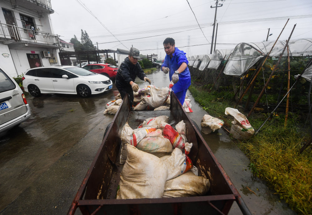 7月26日,在嘉兴市南湖区大桥镇江南村,抢险人员在运送沙袋封堵河堤,防止河水漫入大棚。新华社记者 徐昱 摄