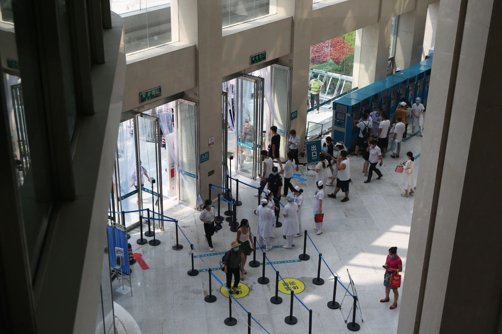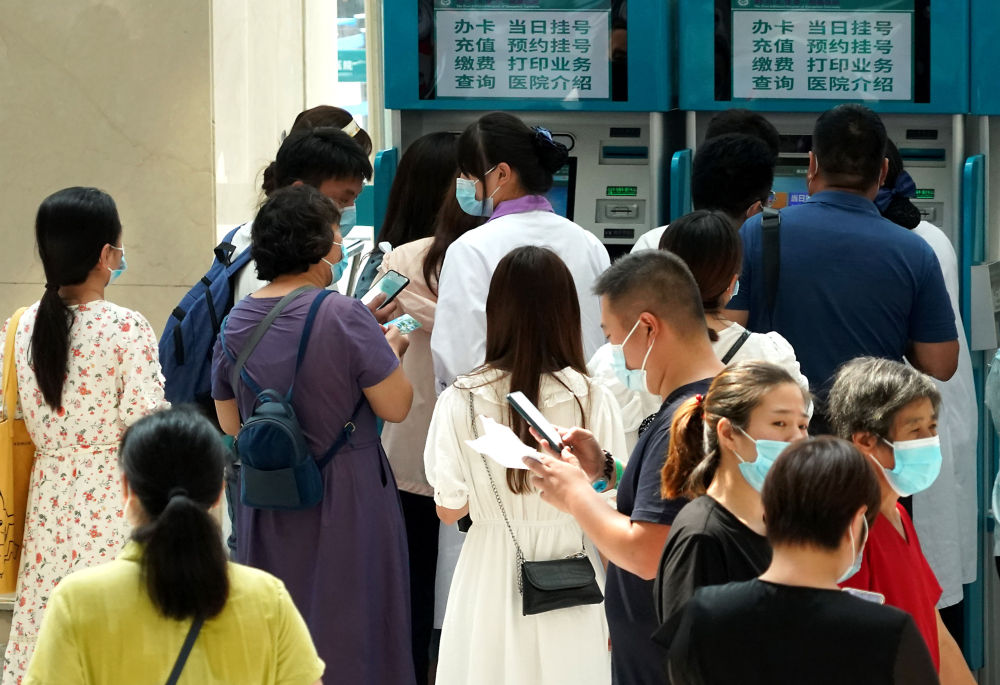 ↑7月26日,患者在郑大一附院河医院区排队使用自助机服务。
