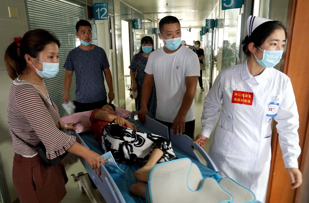 ↑7月26日,医生在郑大一附院河医院区转移患者。