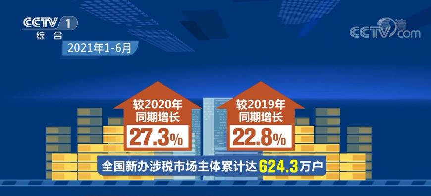 国家税务总局今天发布数据显示,今年1—6月,全国新办涉税市场主体累计达624.3万户,较2020年和2019年同期分别增长27.3%和22.8%。