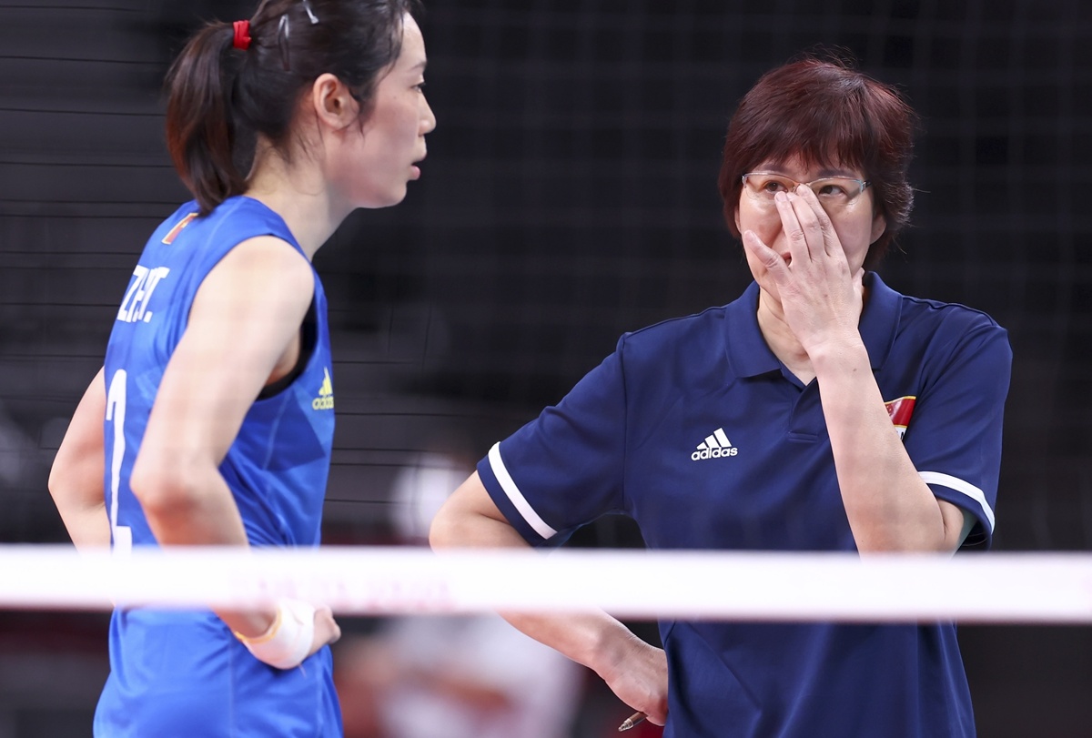 7月27日,中国队主教练郎平(右)向队员朱婷面授机宜。新华社记者兰红光摄