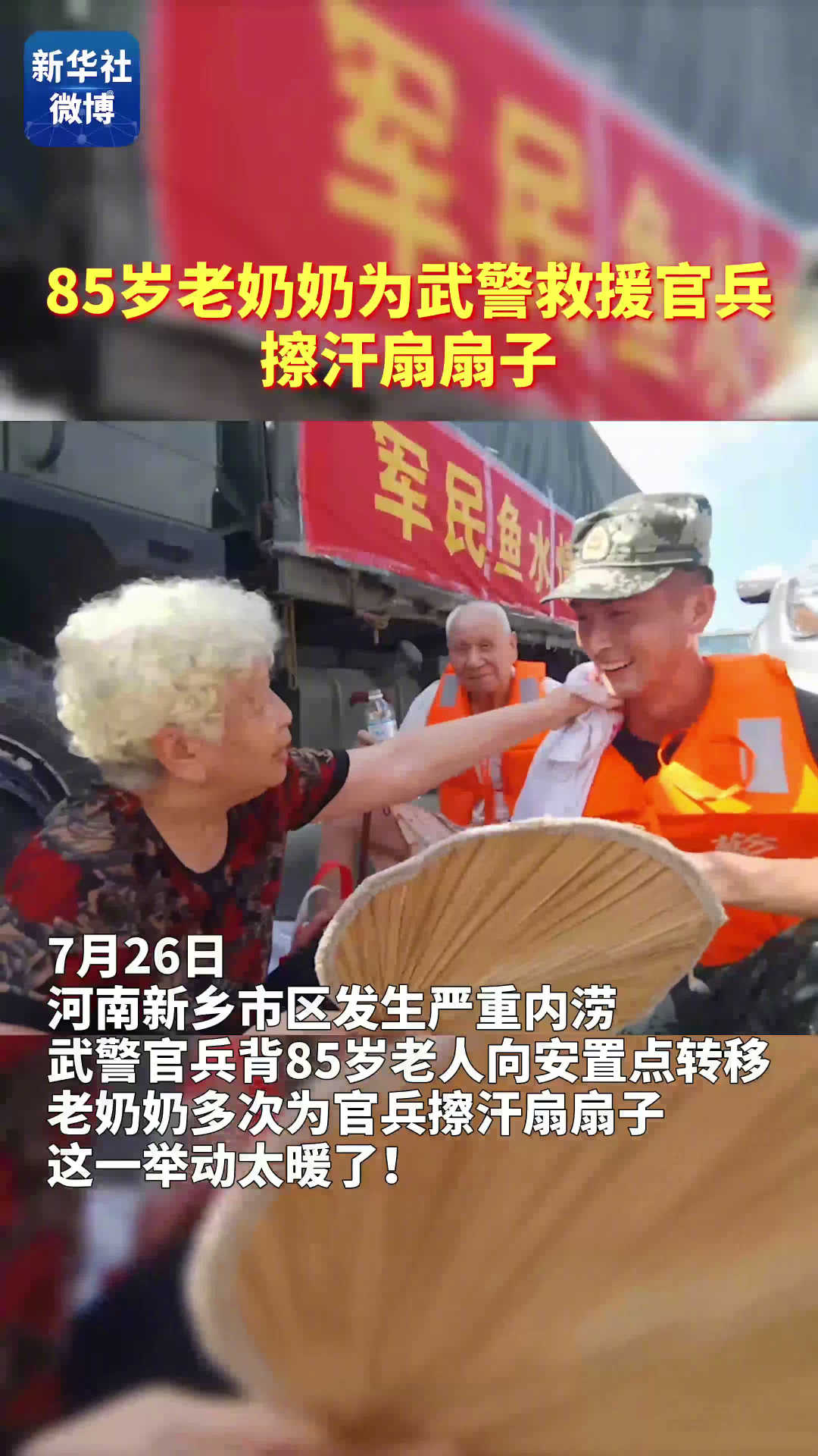 【#85岁老奶奶为武警救援官兵擦汗扇扇子#】7月26日,河南新乡卫辉市发生严重内涝。武警官兵背着85岁的老人向安置点转移,途中老人多次为官兵擦汗扇扇子,这一举动太暖了!#河南加油河南挺住# 新华社的微博视频