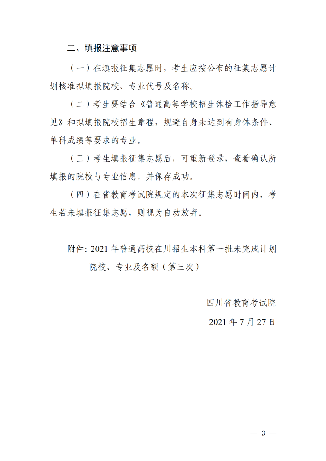 7月27日,四川在线从省教育考试院获悉,四川从今日16:00起启动本科第一批未完成计划院校第三次征集志愿,志愿征集截至时间为27日23:00。