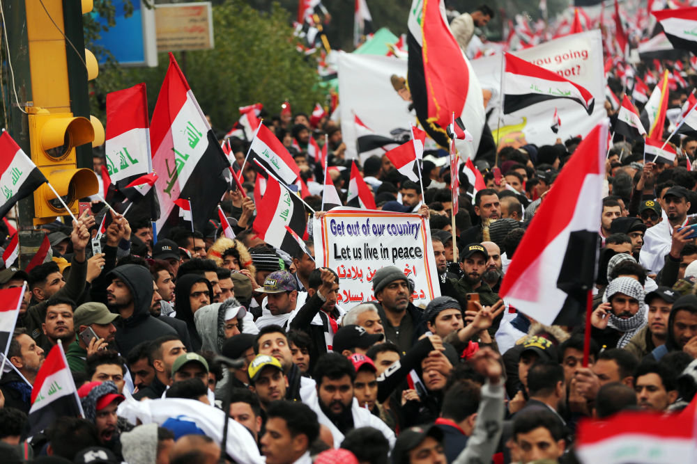 2020年1月24日,在伊拉克首都巴格达,大批伊拉克人举行抗议示威,要求美军撤离伊拉克。(新华社发,哈利勒·达伍德摄)
