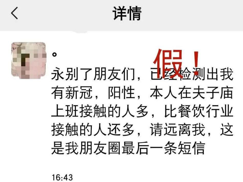 7月22日,南京网民贺某在朋友圈内发布消息称“已检测出新冠阳性,本人在夫子庙上班接触的人多,请远离我”。经核实,贺某因与男友吵架心情不好,故意编造发布了上述虚假信息。目前,贺某已被属地公安机关依法行政拘留。