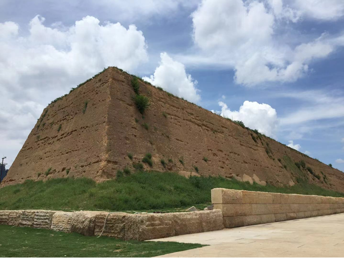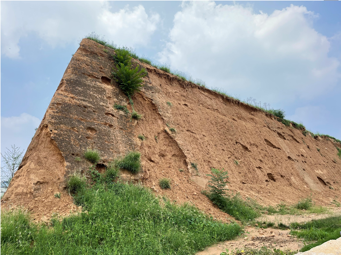 △郑州商城遗址墙体剥落 中间平整墙面为未剥落段 包裹里面的墙体本体没有受损