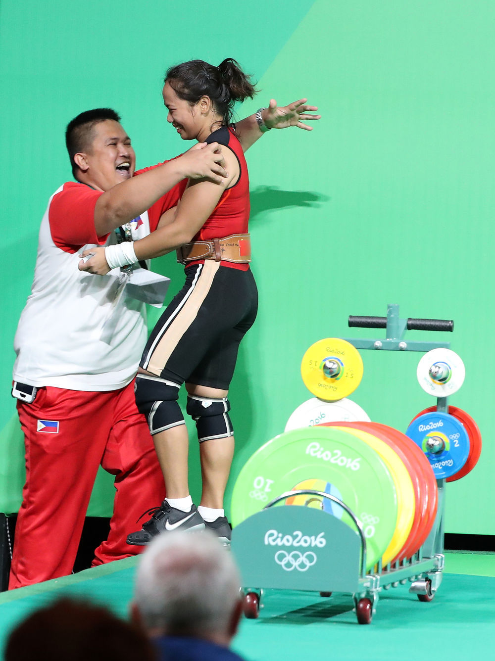 资料图:2016年8月7日,菲律宾选手迪亚兹(右)在试举成功后庆祝。新华社记者 李明 摄