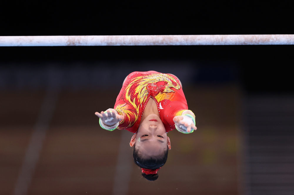 中国队选手唐茜靖在高低杠项目比赛中。新华社记者 曹灿 摄
