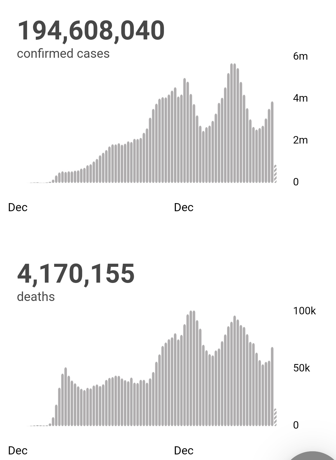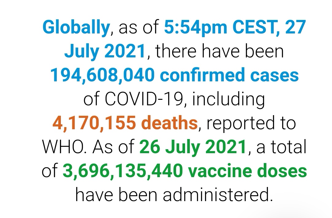 根据世卫组织最新实时统计数据,截至欧洲中部夏令时间7月27日17时54分(北京时间7月27日23时54分),全球累计新冠肺炎确诊病例194608040例,累计死亡病例4170155例。27日全球新冠肺炎确诊病例新增410645例,死亡病例新增7628例。(总台记者 薛婧萌)