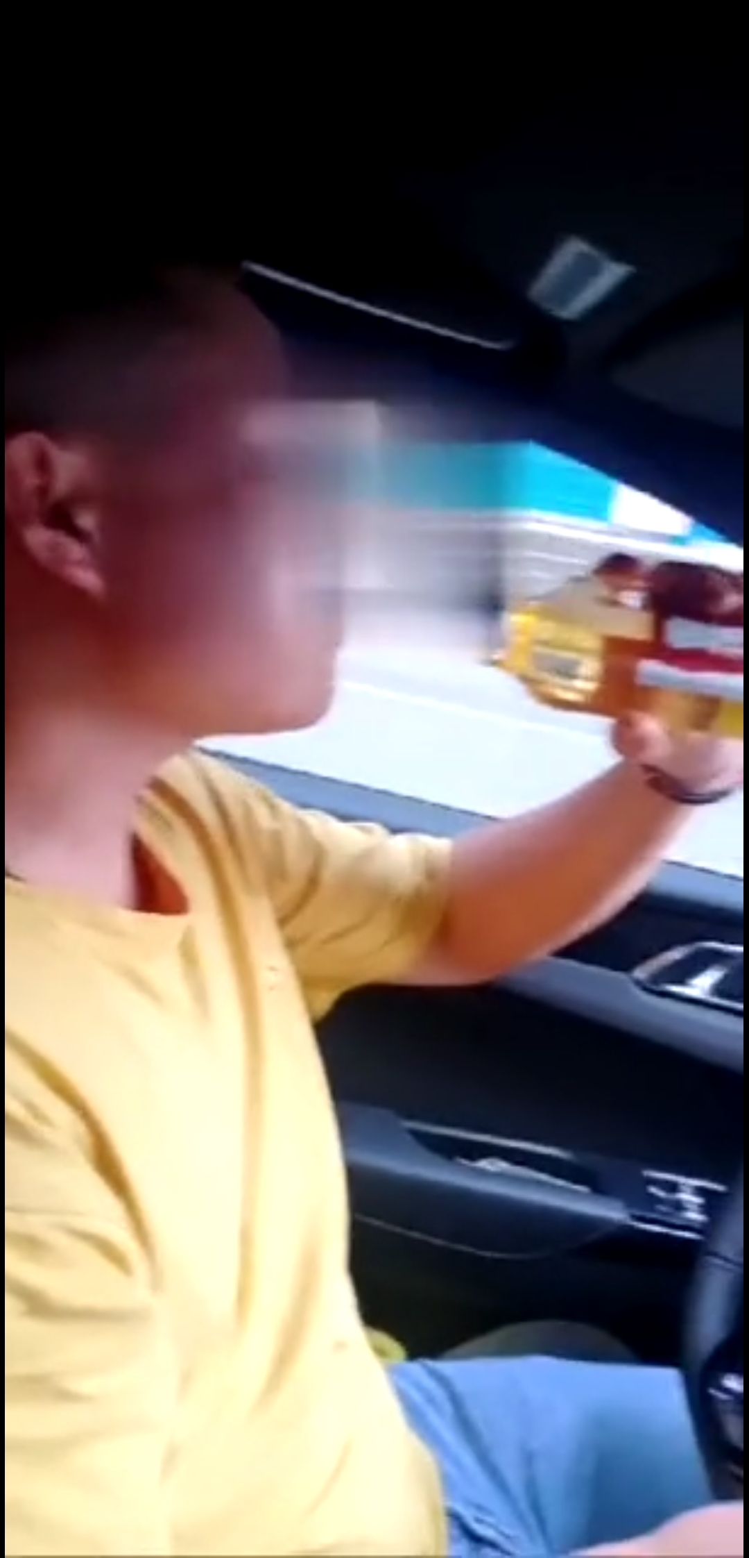 视频中,该男子脸色通红,手持一瓶啤酒,一边喝酒,一边开车,肆无忌惮,十分危险。