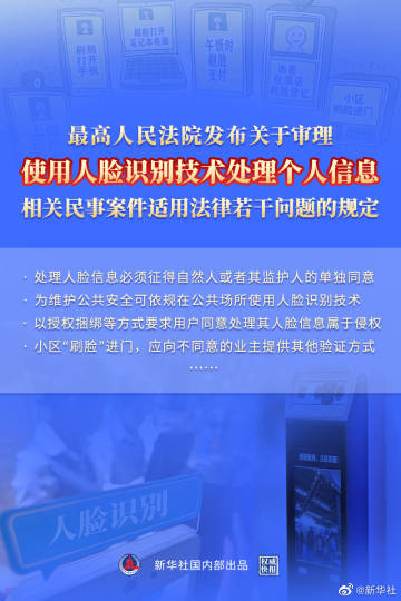 【#权威快报#|#最高法明确经营场所滥用人脸识别属于侵权#】商家未经消费者同意擅自采集人脸信息进行数据分析、物业强制将人脸识别作为业主出入的唯一验证方式……解决这些纠纷有了新的依据。《最高人民法院关于审理使用人脸识别技术处理个人信息相关民事案件适用法律若干问题的规定》28日公布,对经营场所滥用人脸识别技术、小区“刷脸”进门等问题作出明确规定。(记者罗沙、白阳)