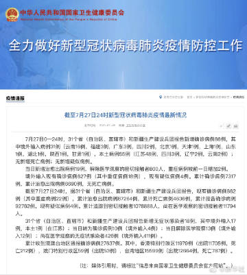 截至7月27日24时,据31个省(自治区、直辖市)和新疆生产建设兵团报告,现有确诊病例862例(其中重症病例22例),累计治愈出院病例87264例,累计死亡病例4636例,累计报告确诊病例92762例,现有疑似病例4例。累计追踪到密切接触者1078888人,尚在医学观察的密切接触者11794人。