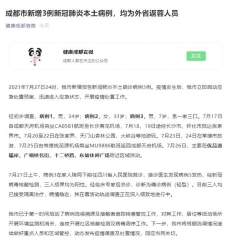 疫情发生后,成都市立即启动应急处置预案,迅速进入应急状态,开展疫情处置工作。经初步调查,病例1,男,34岁;病例2,女,33岁;病例3,男,7岁,系一家三口。7月17日自成都天府机场乘坐CA8581航班至长沙黄花机场,7月18日、19日途经长沙市、怀化市抵达张家界市。7月20日至22日在张家界等地游玩。7月23日、24日在常德市旅游,7月25日由常德桃花源机场乘坐MU9886航班返回成都天府机场。7月26日,主要在成都优品道曦岸、广福桥北街、十二桥路、东坡休闲广场附近区域活动。