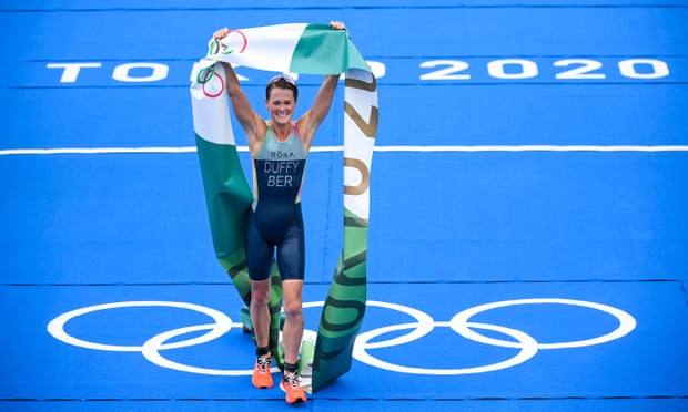 △东京奥运会铁人三项女子个人赛中,弗洛拉·达菲冲过终点 图片来源:英国《卫报》