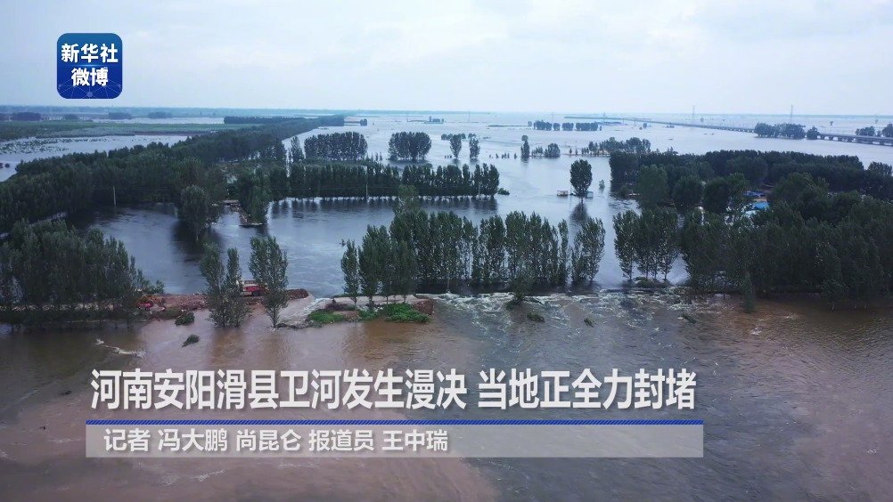 #滑县浚县附近防洪形势严峻#【#滞洪区洪水回灌卫河威胁滑县浚县县城#】近日,由于卫河分洪,大量洪水涌入位于河南滑县、浚县的卫河右侧长虹渠滞洪区。长虹渠滞洪区饱和后,洪水漫过卫河右岸堤顶,回灌卫河,漫堤演化为决口。滑县正组织数百名救援人员,全力进行封堵,减轻卫河下游防洪压力。据现场指挥封堵的一位滑县负责人介绍,如果漫决持续,重新流入卫河的洪水持续增加,将对卫河下游的滑县及浚县县城造成威胁。(记者冯大鹏、尚昆仑)#河南加油河南挺住# 新华社的微博视频