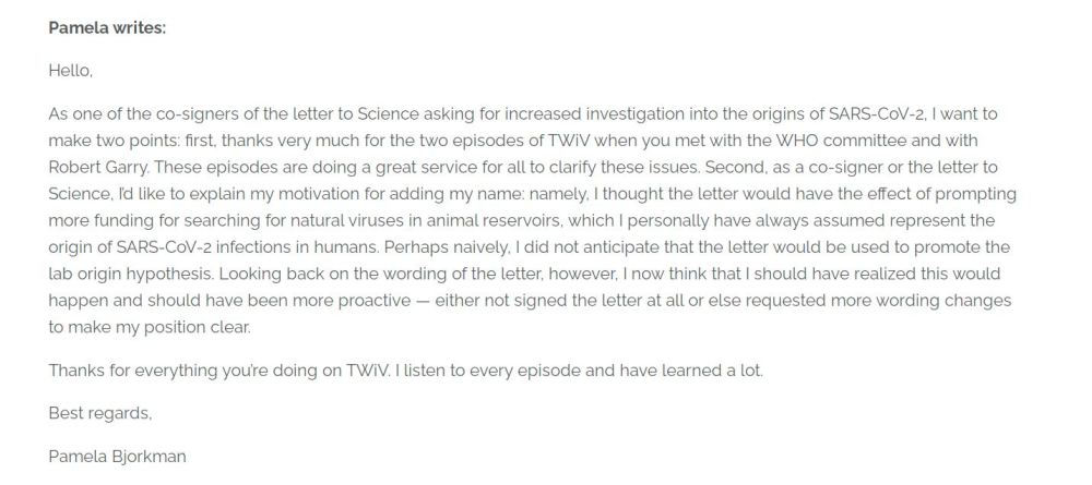 “我也许天真了,没想到这封信会被用来推广实验室起源假说,”比约克曼写道,“回顾这封信的措辞,我现在认为我本应预料到这样的后果。我本应更加积极主动——要么根本不签署这封信,要么要求修改更多措辞以表明我的立场。”