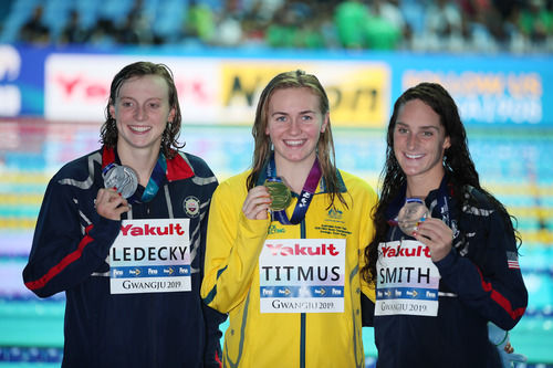 资料图:2019年7月21日,世界游泳锦标赛女子400米自由泳决赛颁奖仪式中冠军澳大利亚选手蒂特马斯(中)、亚军美国选手莱德茨基(左)和季军史密斯(右)的合影。新华社记者 白雪飞 摄