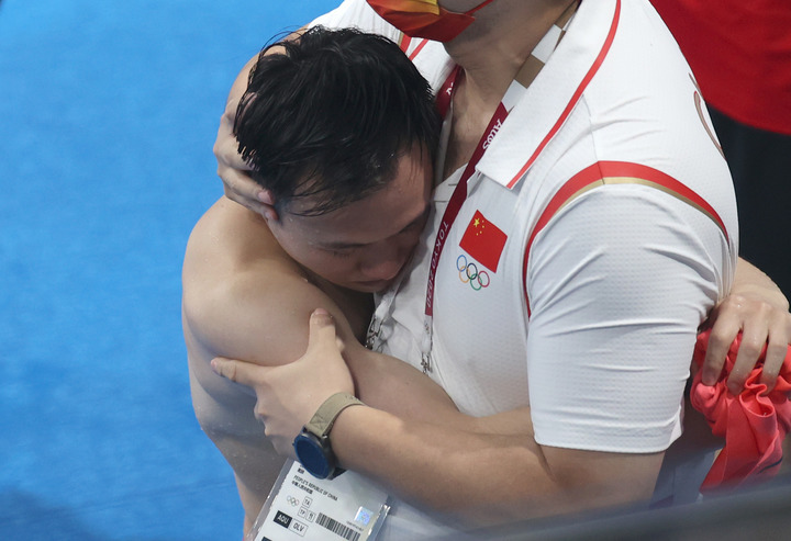 7月28日,中国选手谢思埸(左)赛后与队医魏东凌拥抱。当日,在东京奥运会男子双人三米跳板决赛中,中国选手谢思埸/王宗源获得冠军。新华社记者 丁旭 摄