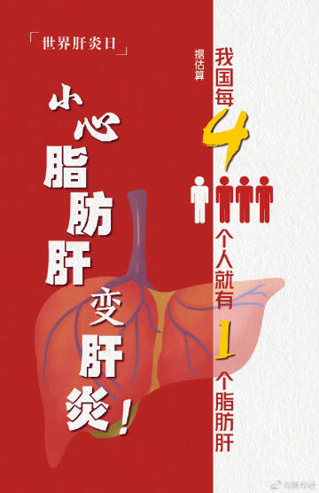 【#我国脂肪肝患者数量超过乙肝患者#】今年7月28日是第十一个世界肝炎日。业内人士介绍,根据有关研究推算,我国非酒精性脂肪性肝病患病率高达25%,患病人群已超过乙肝,构成严重的公共卫生问题。脂肪肝如果不进行干预,可能发展为脂肪性肝炎,甚至肝癌;病程大致分为单纯性脂肪肝、脂肪性肝炎、肝纤维化或肝硬化、肝细胞癌4个阶段。