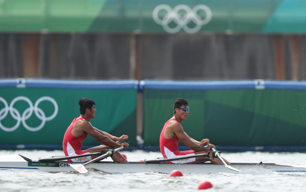 7月28日,刘治宇(左)/张亮在男子双人双桨比赛中。新华社记者 杜潇逸 摄