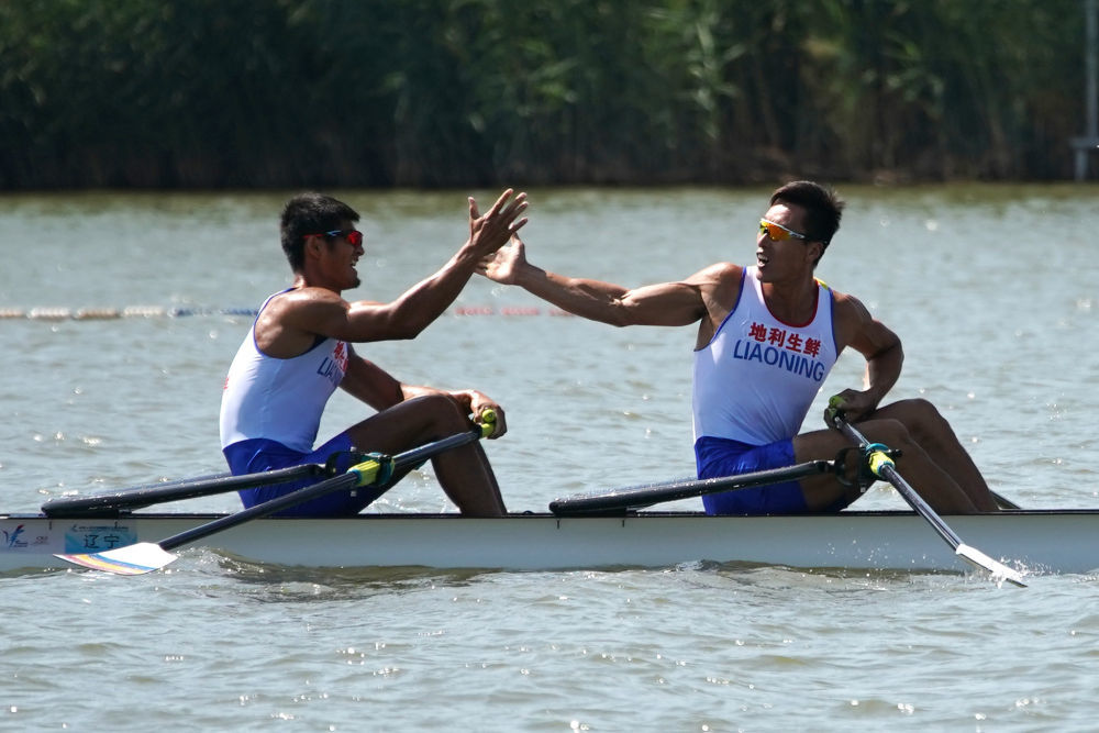 资料图:2017年8月30日,刘治宇(右)和张亮(左)在第十三届全运会赛艇项目男子双人双桨决赛后庆祝。新华社记者 鞠焕宗 摄