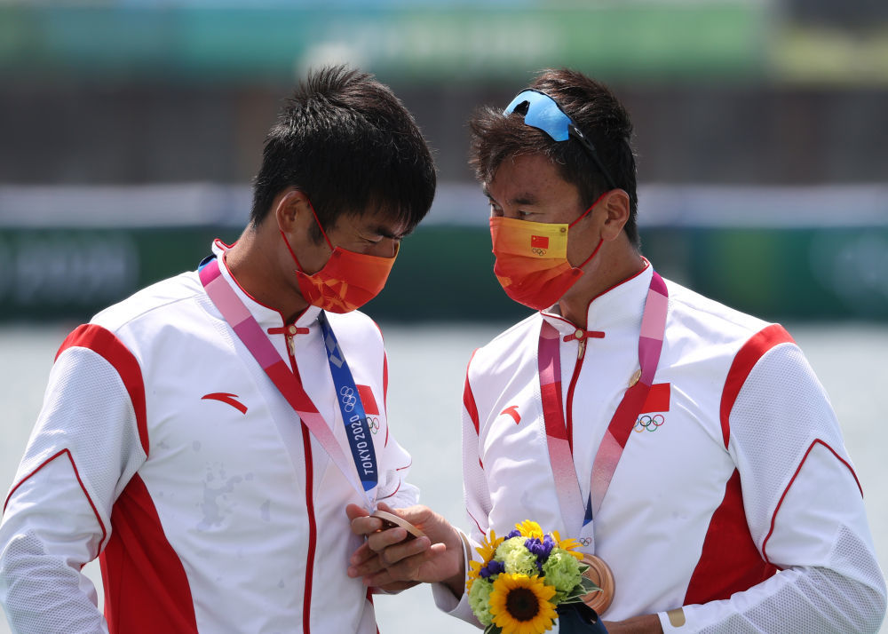 7月28日,刘治宇(左)/张亮在男子双人双桨颁奖仪式上。新华社记者 杜潇逸 摄