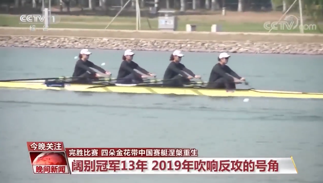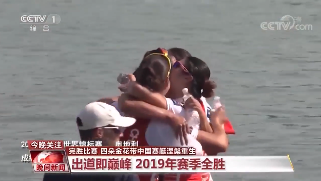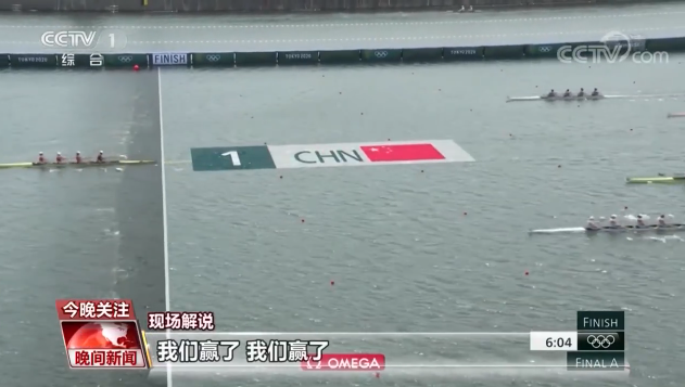 现场解说:最后两桨,我们赢了,我们赢了,中国姑娘赢下了这枚金牌,中国赛艇女子四人双桨再次站上了世界最高领奖台!