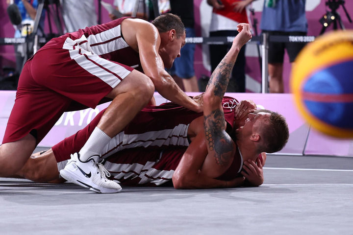 7月28日,拉脱维亚队队员赛后庆祝。当日,在东京奥运会三人篮球男子组决赛中,拉脱维亚队胜俄罗斯运动员,夺得金牌。新华社记者 兰红光 摄