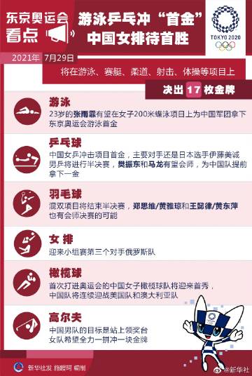 【东京奥运今日看点:#中国女排VS俄罗斯女排争首胜#】29日,东京奥运会将决出17枚金牌。首场遗憾摘银后,张雨霏将力争女子200米蝶泳冠军,#中国军团冲击东京奥运会游泳首金#。冲击项目首金的还有乒乓球,中国女乒的主要对手还是日本选手伊藤美诚,乒乓球男单和羽毛球混双都存在中国选手会师决赛的可能。#中国队加油#!
