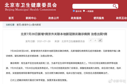 【#北京28日新增1例京外关联本地新冠肺炎确诊病例#】北京市卫生健康委29日通报,7月28日0时至24时,北京市新增1例京外关联本地新冠肺炎确诊病例,无新增疑似病例和无症状感染者;无新增境外输入确诊病例、疑似病例和无症状感染者;治愈出院1例。