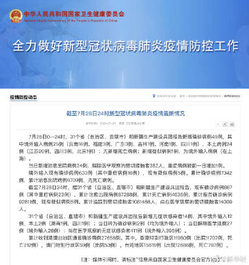 【#28日新增确诊病例49例# 其中,#28日新增本土确诊病例24例#】据国家卫健委网站,7月28日0—24时,31个省(自治区、直辖市)和新疆生产建设兵团报告新增确诊病例49例,其中境外输入病例25例(云南16例,福建3例,广东3例,吉林1例,河南1例,四川1例),本土病例24例(江苏20例,四川3例,北京1例);无新增死亡病例;新增疑似病例1例,为境外输入病例(在上海)。