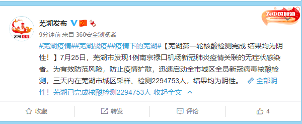 据“芜湖发布”消息,7月25日,芜湖市发现1例南京禄口机场新冠肺炎疫情关联的无症状感染者。为有效防范风险,防止疫情扩散,迅速启动芜湖全市城区全员新冠病毒核酸检测,三天内在芜湖市城区采样、检测2294753人,结果均为阴性。