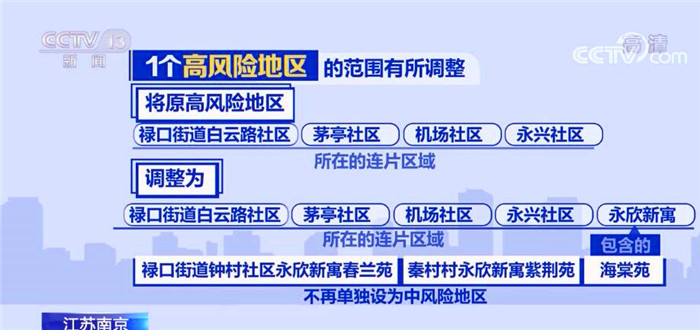 1个高风险地区的范围有所调整,将原高风险地区禄口街道白云路社区、茅亭社区、机场社区和永兴社区所在的连片区域调整为禄口街道白云路社区、茅亭社区、机场社区、永兴社区和永欣新寓所在的连片区域。永欣新寓包含的禄口街道钟村社区永欣新寓春兰苑、秦村村永欣新寓紫荆苑、海棠苑不再单独设为中风险地区。其他地区风险等级不变。调整后南京市共有4个高风险地区。