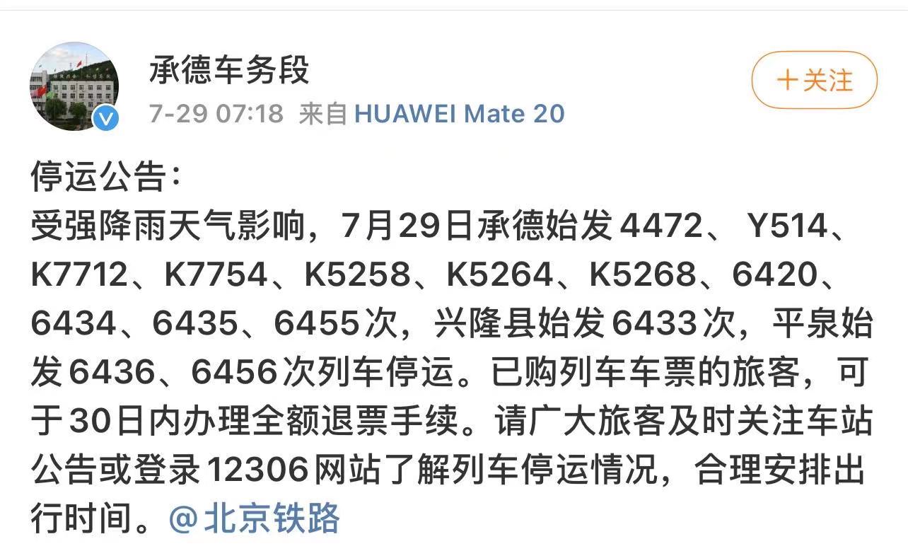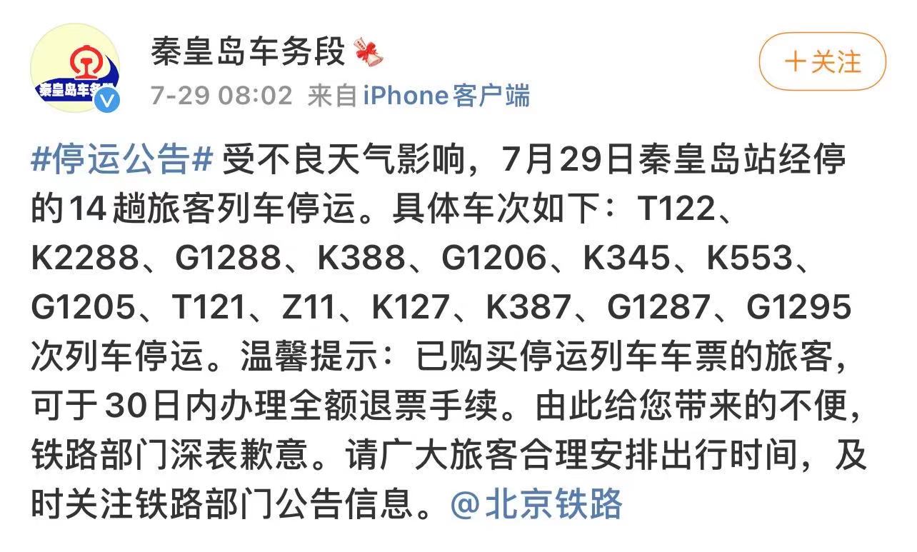 据中国铁路北京局集团公司承德车务段、秦皇岛车务段消息,受强降雨天气影响,7月29日承德始发4472、 Y514、 K7712、K7754、K5258、K5264、K5268、6420、6434、6435、6455次,兴隆县始发6433次,平泉始发6436、6456次列车停运。7月29日秦皇岛站经停的14趟旅客列车停运。具体车次如下:T122、K2288、G1288、K388、G1206、K345、K553、G1205、T121、Z11、K127、K387、G1287、G1295次列车停运。已购列车车票的旅客,可于30日内办理全额退票手续。