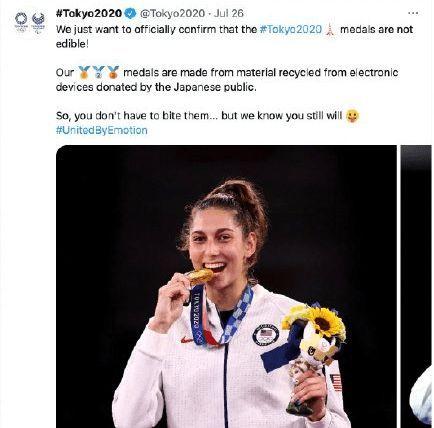 东京奥组委日前发文,提醒运动员们“没必要咬”奖牌,因为东京奥运会奖牌的材料是从电子设备中回收的:“我们的奖牌是由日本民众捐赠的电子设备的回收材料而制成的。所以你不必咬它们......但我们知道你们还是会咬。”