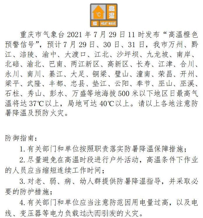 重庆市气象台2021年7月29日11时发布“高温橙色预警信号”,预计7月29日、30日、31日,重庆万州、黔江、涪陵、渝中、大渡口、江北、沙坪坝、九龙坡、南岸、北碚、渝北、巴南、两江新区、高新区、长寿、江津、合川、永川、南川、綦江、大足、铜梁、璧山、潼南、荣昌、开州、梁平、武隆、丰都、忠县、垫江、云阳、奉节、巫山、巫溪、石柱、秀山、彭水、万盛等地海拔500米以下地区日最高气温将达37℃以上,局地可达40℃以上。请以上各地注意防暑降温及预防火灾。