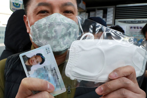 2020年3月9日,在韩国首尔,一名男子展示他凭身份证刚刚购买到的口罩。(新华社/纽西斯通讯社)