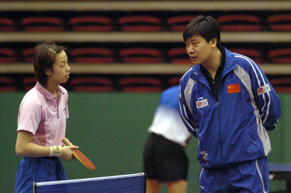 资料图:教练李隼(右)与弟子张怡宁交流技术。新华社记者周文广摄