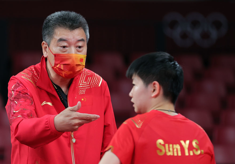 7月27日,孙颖莎在比赛间隙接受教练李隼(左)的指导。新华社记者王东震摄
