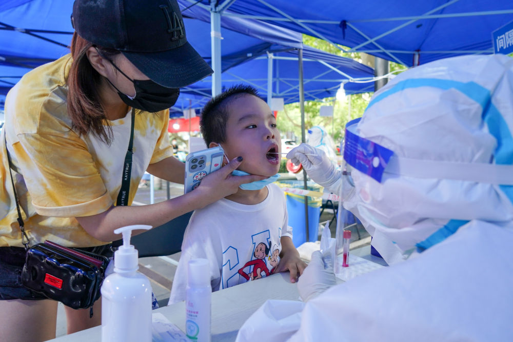 ↑7月29日,一位小朋友在南京市玄武区新街口街道北门桥社区核酸检测点进行核酸检测取样。