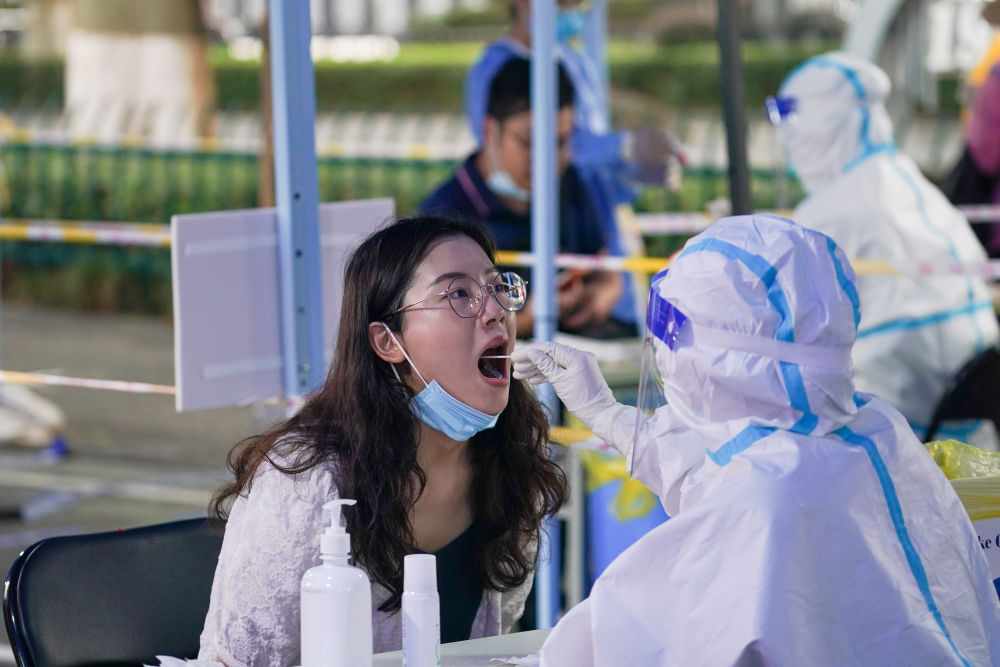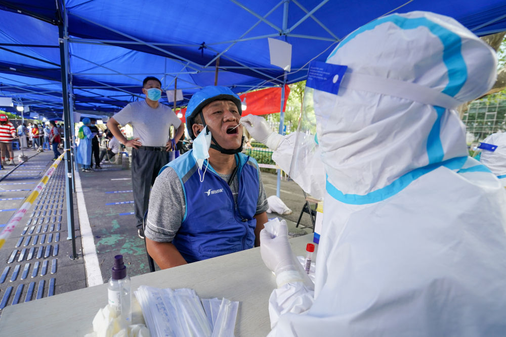 ↑7月29日,市民在南京市玄武区新街口街道北门桥社区核酸检测点进行核酸检测取样。