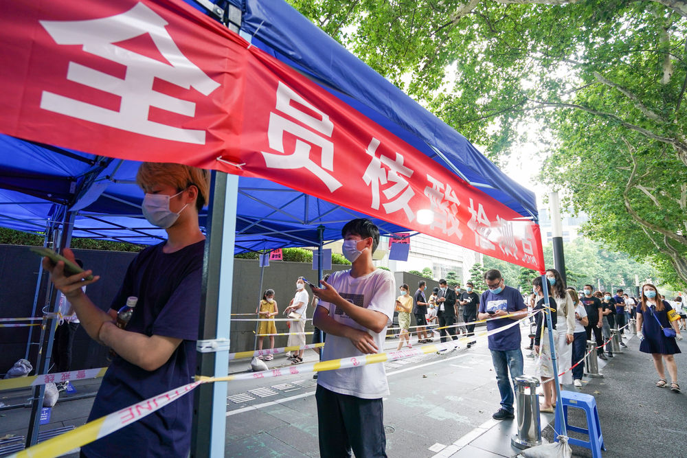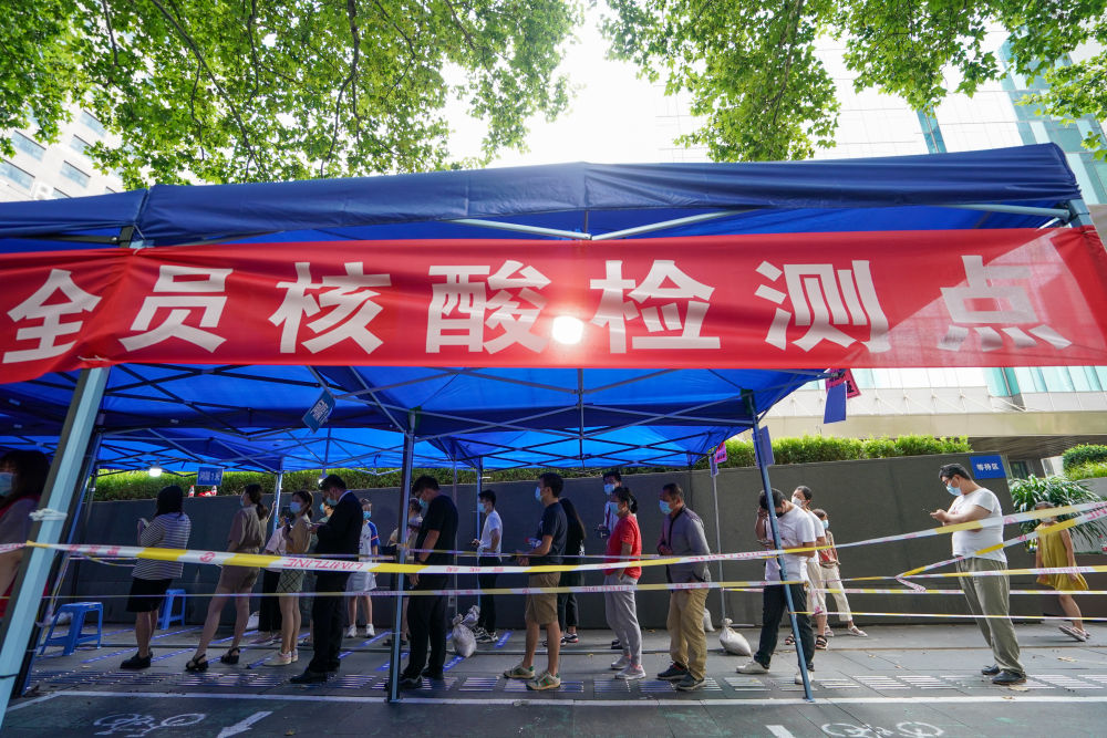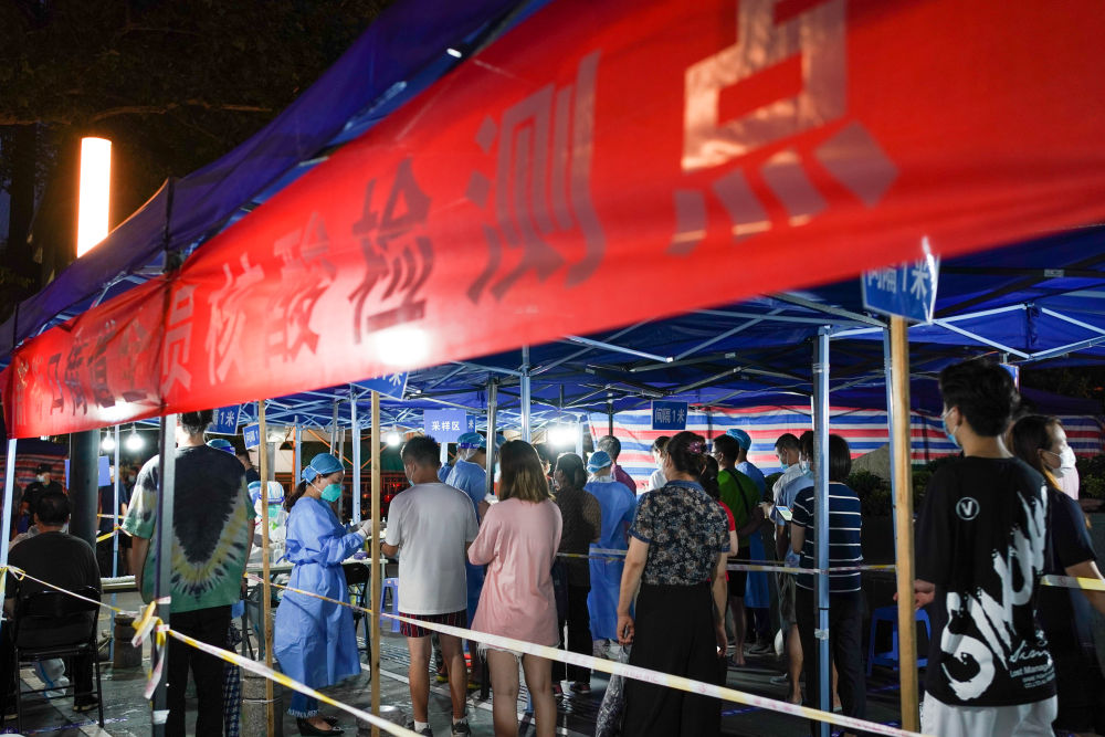 ↑7月29日,市民在南京市玄武区新街口街道北门桥社区核酸检测点排队等待进行核酸检测取样。