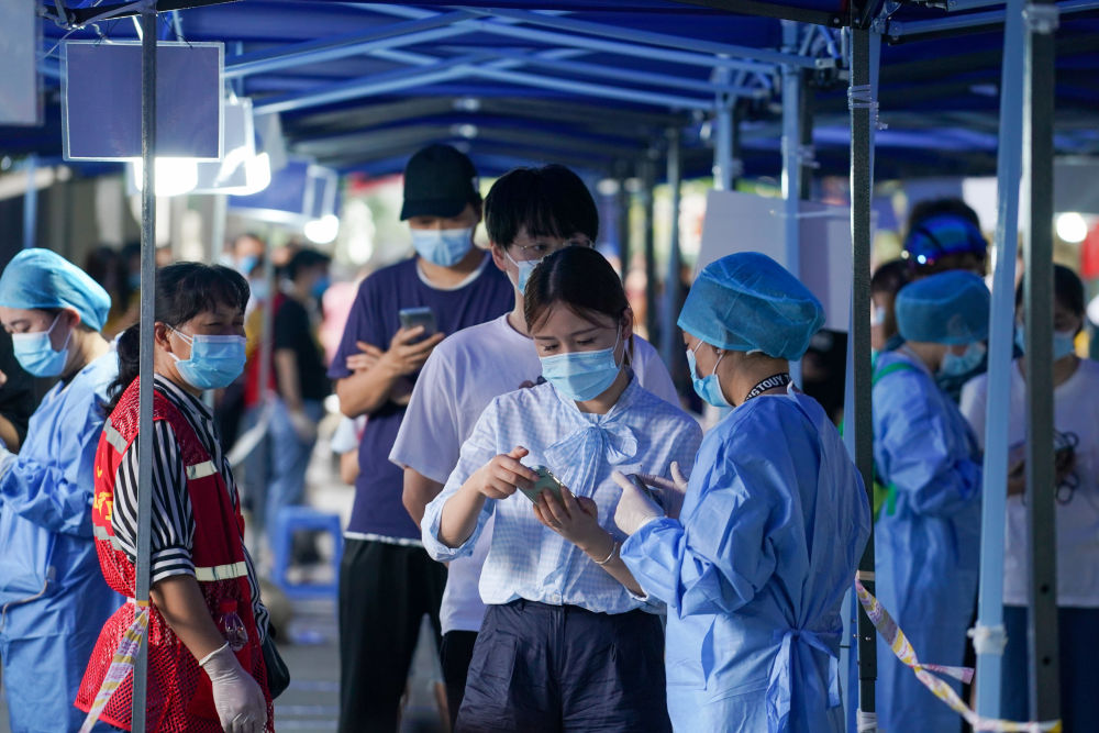 ↑7月29日,在南京市玄武区新街口街道北门桥社区核酸检测点,工作人员在为市民登记身份信息。