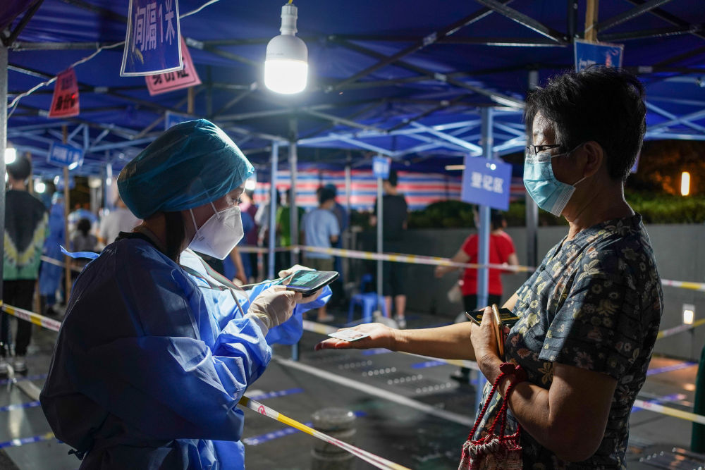 ↑7月29日,在南京市玄武区新街口街道北门桥社区核酸检测点,工作人员在用手机扫描市民身份证信息。