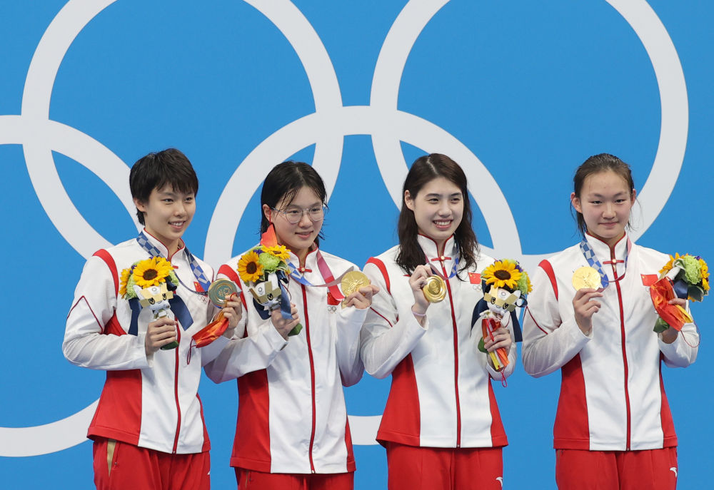 7月29日,杨浚瑄、汤慕涵、张雨霏、李冰洁(从左到右)在颁奖仪式上。新华社记者丁旭摄