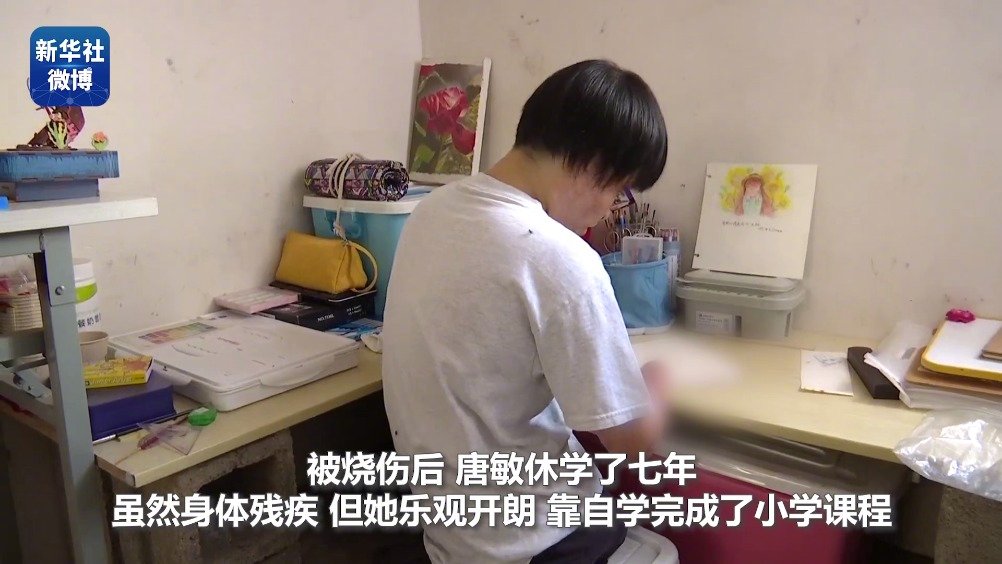 【#云南烧伤女孩圆梦大学#】近日,昆明市宜良县“烧伤女孩”唐敏考上大学的故事在当地传开了。这个姑娘13年前为救弟弟毅然冲进火海,全身烧伤面积达85%,不得不接受高位截肢,双手仅留下一个手指。在“浴火重生”后,坚韧的她乐观生活,努力学习,用右手手臂与左手仅存拇指夹着笔完成高考,以588分被中华女子学院录取。(记者孙敏) 新华社的微博视频