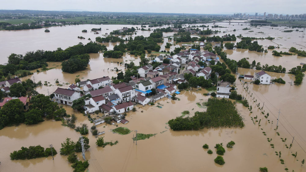 遭遇水灾的安徽省郎溪县涛城镇梅村村(无人机照片,7月28日摄)。