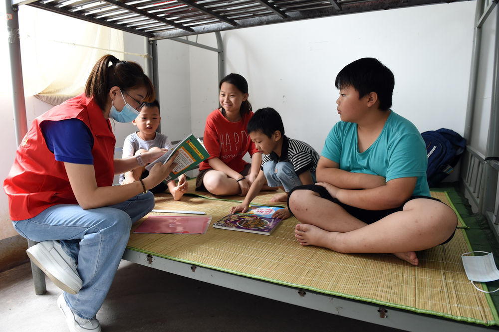 7月29日,在位于郎溪县建平镇老金桥中学的临时安置点,志愿者(左一)给小朋友们讲故事。