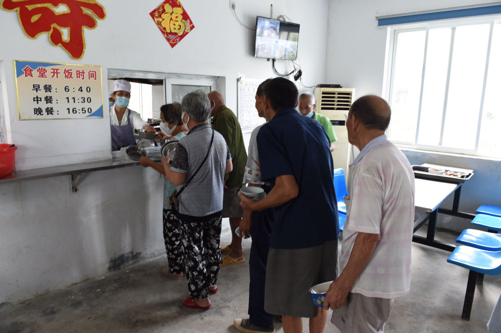 7月28日,在位于郎溪县建平镇敬老院的临时安置点,转移群众排队领取晚餐。