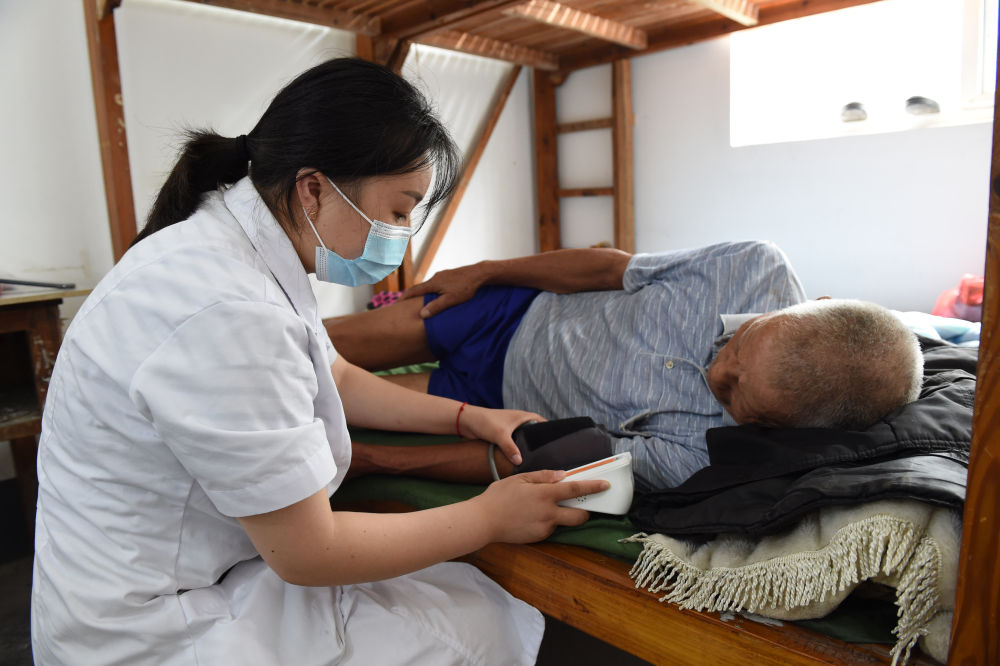 7月29日,在位于郎溪县建平镇老金桥中学的临时安置点,医务人员(左)为转移群众测量血压。